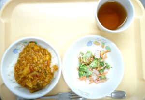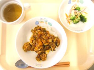 昼食:ごはん、きのこのドライカレー、ブロッコリーとハムのサラダ、麦茶