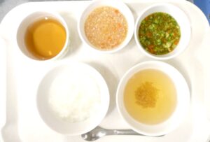 離乳食中期の昼食:おかゆ、豚ひきと野菜のトマト煮、ブロッコリーのおひたし、スープ、麦茶