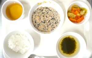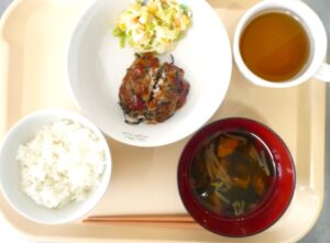昼食:ごはん、ひじきハンバーグ、コールスローサラダ、スープ、麦茶