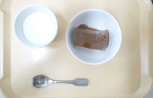 午後おやつ:ココアプリン、牛乳