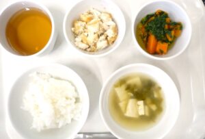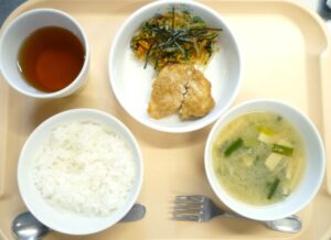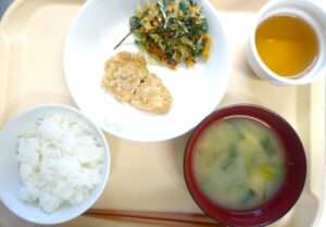 昼食:ごはん、魚のごま味噌だれ、和風春雨サラダ、みそ汁(高野豆腐、にら、切り干し大根)、麦茶