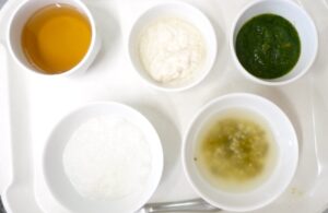 離乳食(中期)午前食:おかゆ、煮魚、おひたし、すまし汁