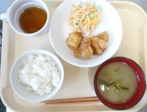 ごはん、から揚げ、もやしサラダ、みそ汁(にら、なめこ、玉ねぎ)、麦茶