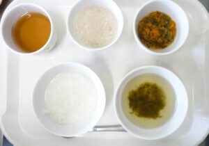 離乳食(中期)午前食:おかゆ、つくね煮、おひたし、すまし汁