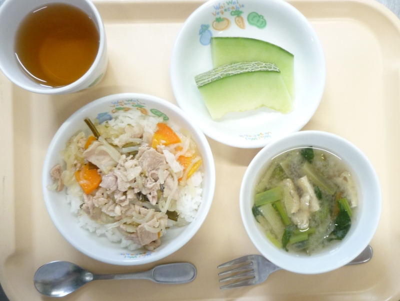 昼食:豚丼、みそ汁(なす、油揚げ、小松菜)、メロン、麦茶 離乳食(後期)の昼食:お粥、野菜のそぼろ煮、みそ汁(なす、小松菜)、麦茶 離乳食(完了期)の昼食:豚丼(軟飯)、みそ汁(なす、油揚げ、小松菜)、メロン、麦茶 &n … “豚丼” の続きを読む