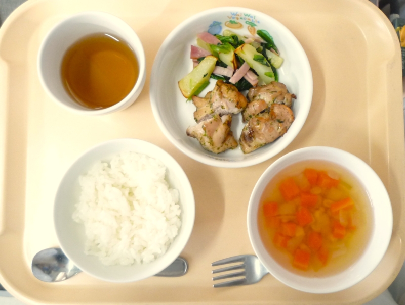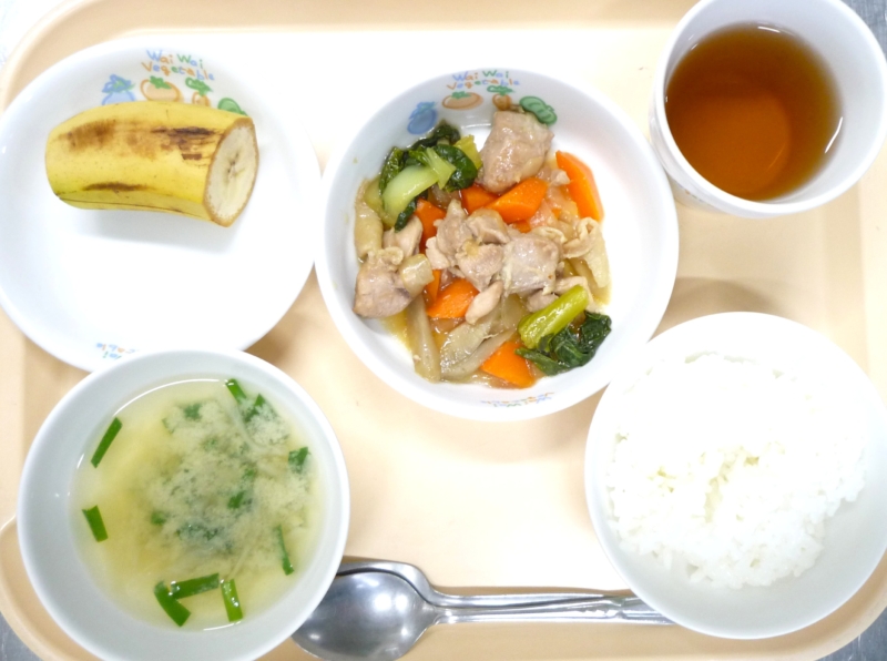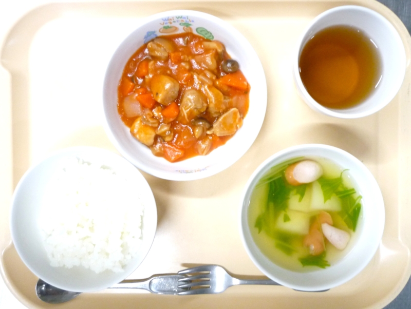 昼食:ごはん、鶏肉のケチャップ煮、ポテトスープ、バナナ、麦茶 鶏肉のケチャップ煮は子どもたちが大好きなケチャップ味でたっぷりの野菜と鶏肉を煮込んでいます。寒さと乾燥で風邪に負けないようにたんぱく質とビタミンをたっぷり … “鶏のケチャップ煮” の続きを読む