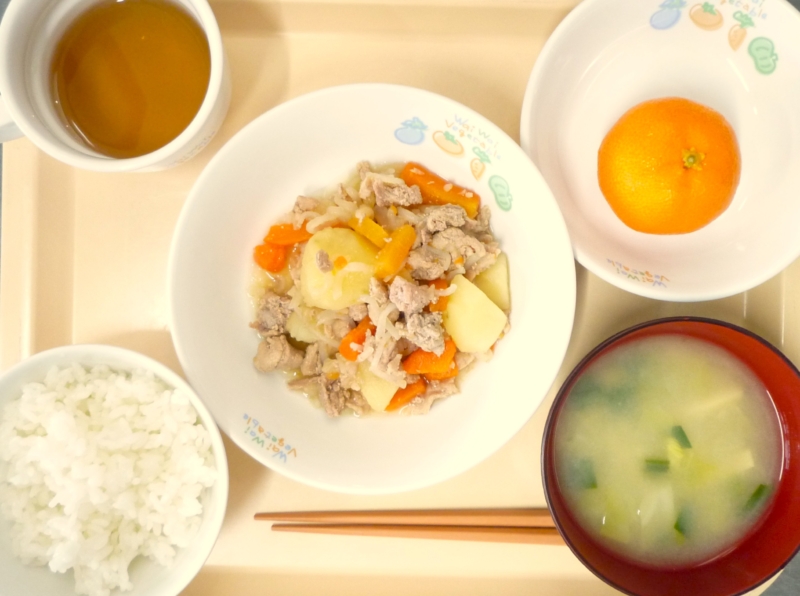 昼食:ごはん、肉じゃが、みそ汁、みかん かつおだしの利いたほっとした味わいの肉じゃがです。じゃがいもには加熱しても壊れにくいビタミンCがたっぷり含まれます。体内の塩分を排出する働きのあるカリウムも豊富です。 離乳食(後期 … “肉じゃが” の続きを読む