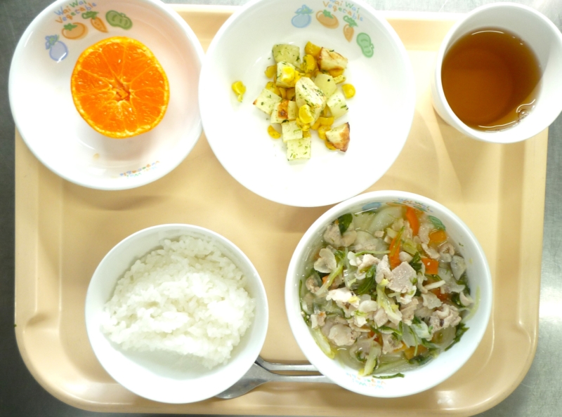 離乳食中期:おかゆ、鶏つくねと白菜のうま煮、じゃがいも煮、すまし汁(みずな)、麦茶 昼食:ごはん、豚肉と白菜のうま煮、コーンポテト、みかん、麦茶 おやつ:五平もち、牛乳 乳児:518㎉ 幼児: … “豚肉と白菜のうま煮” の続きを読む