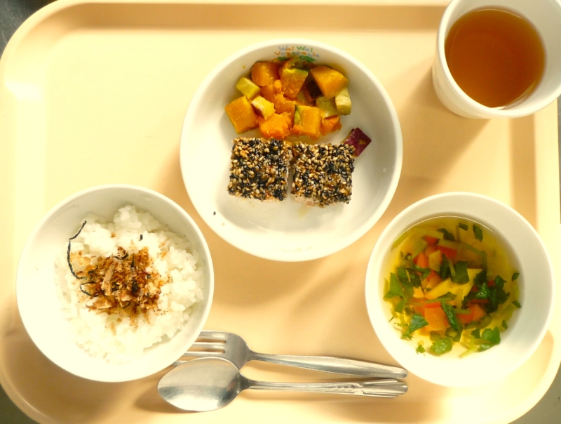 昼食:ふりかけごはん、松風焼き、さつまいもとかぼちゃのきんとん、すまし汁 ふりかけには、すまし汁のかつお節のだしがらを水気を絞り、みじん切りにして、醤油やみりんで味付けして鍋で炒って水分を飛ばして作ります。子どもたちに大 … “松風焼き” の続きを読む