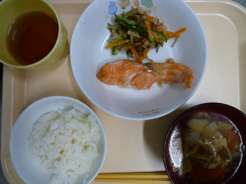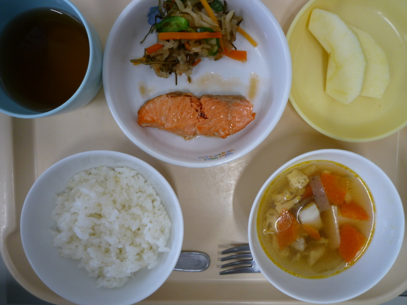 お昼:ご飯、鮭の焼き漬け、はりはり漬け、のっぺい汁(にんじん、里芋、こんにゃく、ごぼう、油揚げ、たけのこ)、りんご(乳児のみ)、麦茶