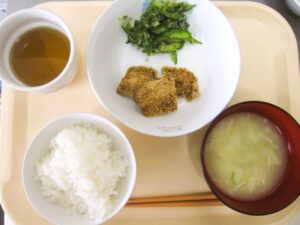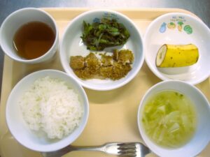 昼食:ご飯、あじの南部焼き、きゅうりのゆかり和え、みそ汁(じゃがいも、えのき、長ねぎ)、バナナ(乳児のみ)、麦茶