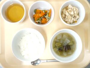 離乳食後期の昼食:軟飯、またはお粥、かじきの南部焼き、オクラのおひたし、みそ汁( 玉ねぎ、なす)、麦茶