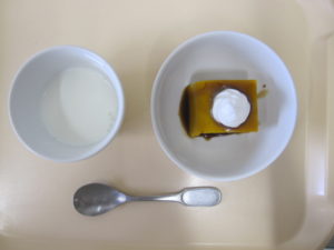 離乳食(後期)午後おやつ:麦茶、かぼちゃプリン