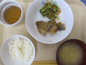 昼食:ご飯、あじの南部焼き、きゅうりのゆかり和え、みそ汁(じゃがいも、キャベツ、えのき)、バナナ(乳児のみ)、麦茶