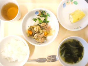 昼食:ご飯、いり鶏、ほうれん草のごま和え、すまし汁、バナナ(乳児のみ)、麦茶