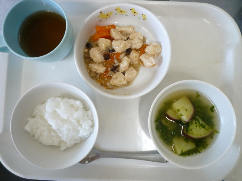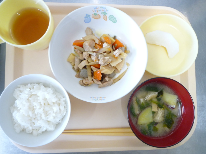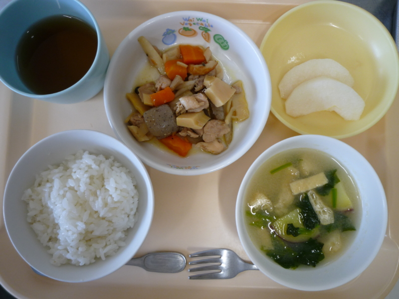 昼食:ご飯、いり鶏(鶏肉、人参、ごぼう、たけのこ、しめじ、ちくわ、こんにゃく)、みそ汁(さつまいも、ほうれん草、油揚げ)、梨、麦茶