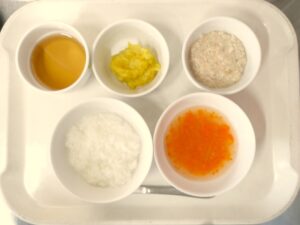 離乳食(中期)午前食:おかゆ、鶏つくね煮、さつまいもとかぼちゃのきんとん、すまし汁