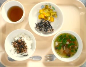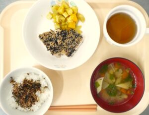 昼食:ふりかけごはん、松風焼き、さつまいもとかぼちゃのきんとん、お雑煮風