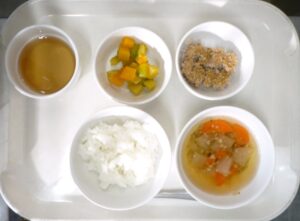 離乳食(後期)昼食:軟飯、松風焼き、さつまいもとかぼちゃのきんとん、すまし汁