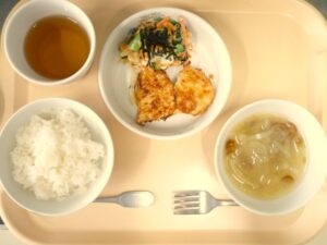 昼食:ごはん、かじきの照り焼き、切干大根のマヨ和え、みそ汁(なめこ、玉ねぎ)、麦茶