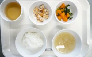 離乳食(後期):おかゆまたは軟飯、かじきの照り焼き、のり和え、みそ汁、麦茶