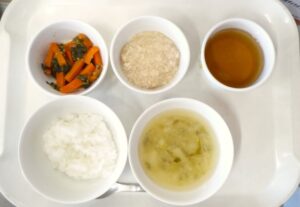 離乳食後期の昼食: 軟飯またはお粥、かじきの照り焼き、ごま和え、みそ汁(じゃがいも、長ねぎ)、麦茶