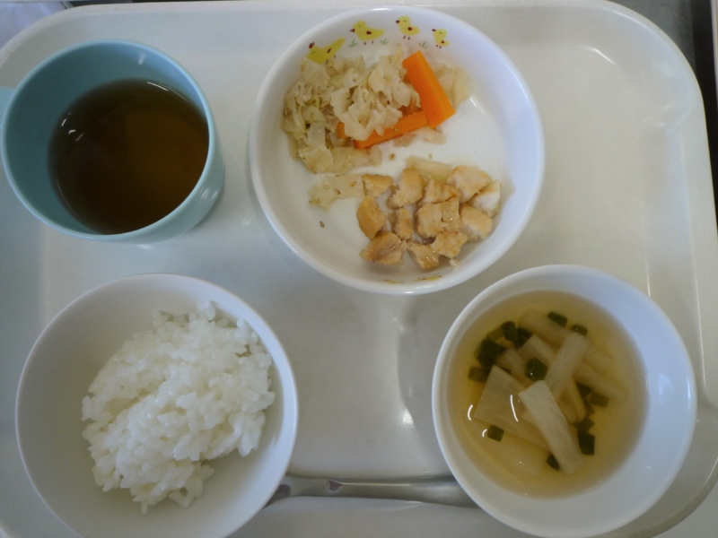 昼食:ご飯、かば焼き風、胡麻酢和え、みそ汁(大根、万能ねぎ、油揚げ)、麦茶、みかん(乳児のみ)