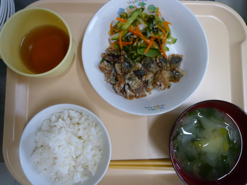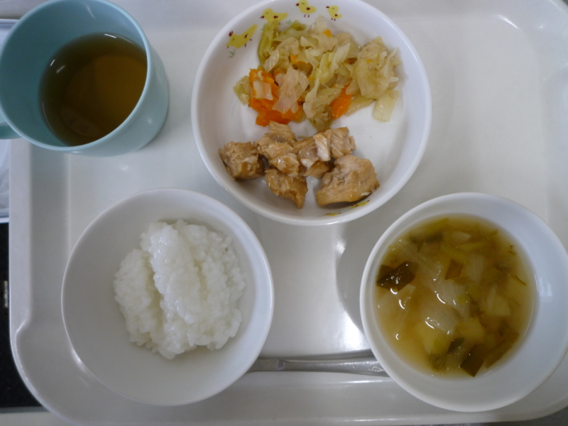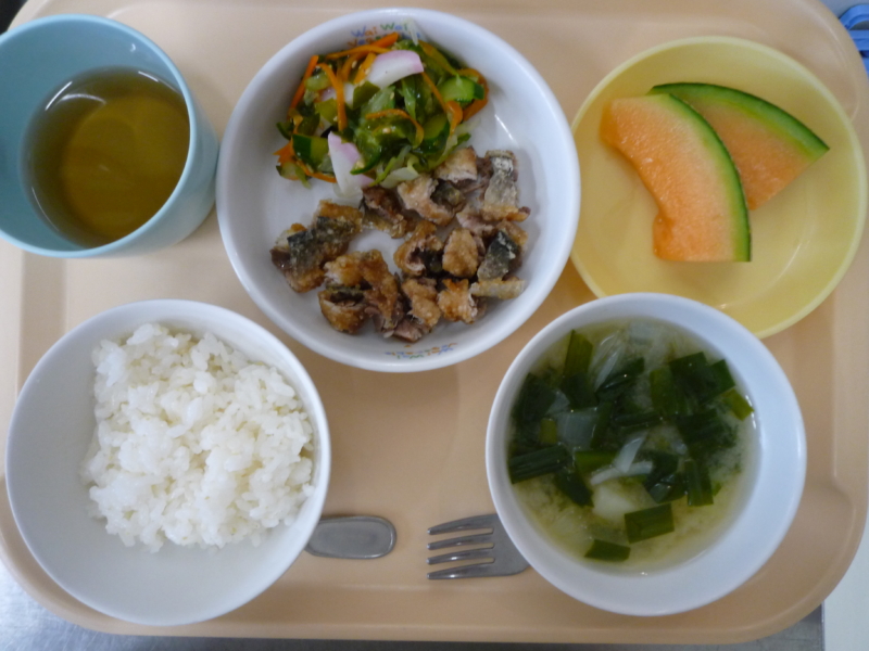 昼食:ご飯、かば焼き風、甘酢和え、みそ汁(じゃがいも、にら、玉ねぎ)、メロン(乳児のみ)、麦茶…乳児304㎉ 幼児361㎉