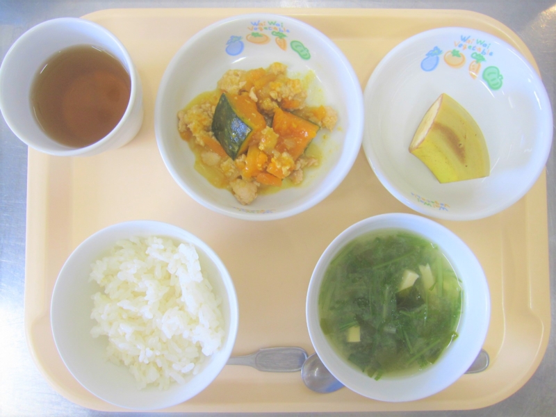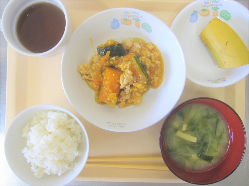 昼食:ご飯、南瓜のそぼろ煮、みそ汁(水菜、わかめ、凍り豆腐)、バナナ、麦茶