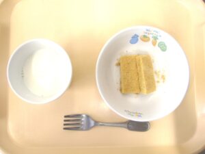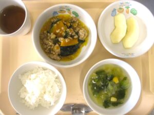昼食:ごはん、かぼちゃのカレー煮込み、菜の花スープ(キャベツ、コーン、菜の花)、りんご