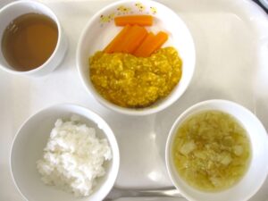 離乳食(中期)午前食:おかゆ、かぼちゃのそぼろ煮、おひたし(人参)、スープ(キャベツ)