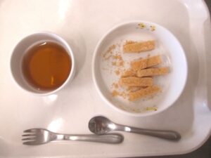 午後おやつ:きなこパン、牛乳