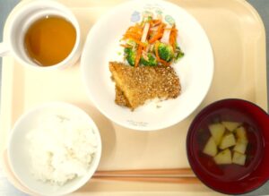 昼食:ごはん、かれいの南部焼き、ブロッコリーのおかか和え、すまし汁
