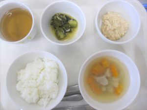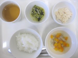 離乳食(中期)午前食:おかゆ、ささみのとろ煮、しらす和え、スープ