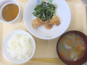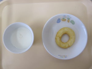 昼食:ごはん、きじ焼き、しらす和え、五目野菜汁(人参、里芋、油揚げ、長ねぎ、ごぼう)、梨(乳児のみ)、麦茶