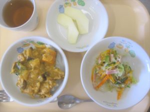 昼食:ごはん、きのこカレー、ごまサラダ、りんご(乳児のみ)、麦茶