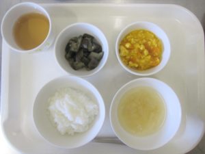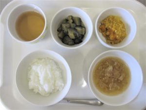 離乳食(後期)昼食:おかゆ又は軟飯、かぼちゃのそぼろ煮、なすのおひたし、スープ