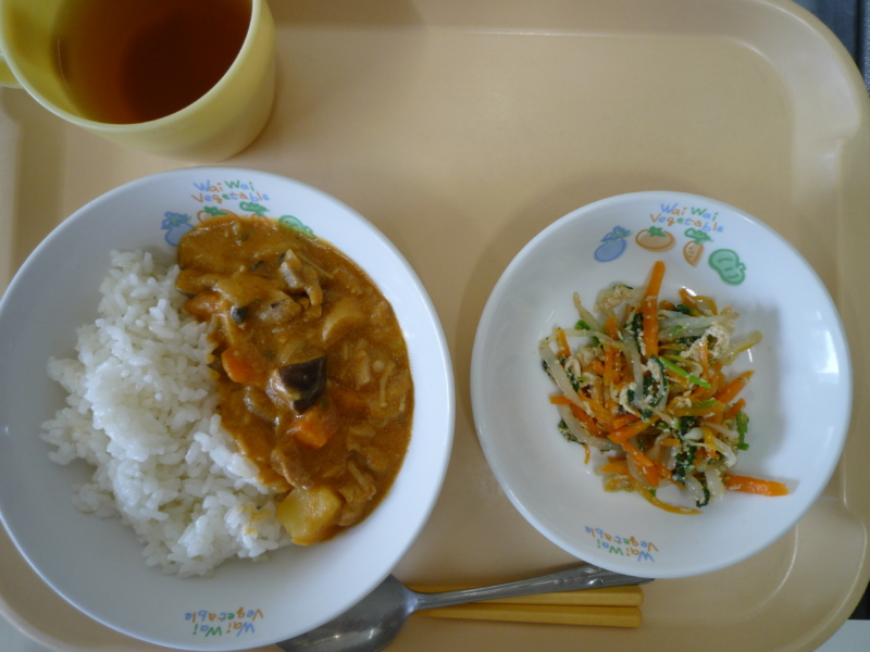 昼食:ご飯、きのこカレー、和風サラダ、りんご(乳児のみ)、麦茶