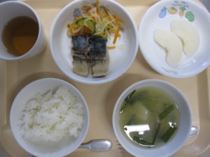 昼食:ご飯、さばの味噌煮、じゃこ和え、みそ汁(里芋、にら、玉ねぎ)、梨、麦茶