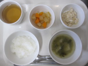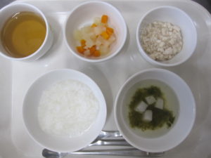 離乳食(中期)午前食:おかゆ、かじきのうま煮、おひたし、スープ、麦茶