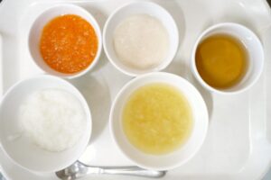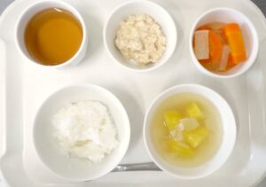 離乳食(後期)昼食:おかゆまたは軟飯、かじきの味噌煮、おひたし、みそ汁