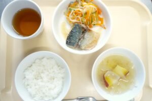 昼食:ごはん、さばの味噌煮、大根のじゃこ和え、味噌汁(さつまいも、たまねぎ)、麦茶