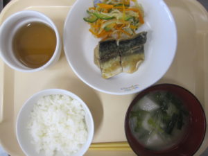 昼食:ご飯、さばの味噌煮、じゃこ和え、みそ汁(里芋、にら、玉ねぎ)、梨、麦茶