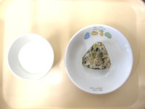 午後おやつ:菜飯おにぎり、牛乳