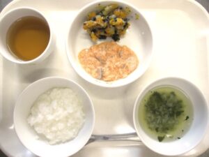 離乳食(中期)午前食:おかゆ、鮭のうま煮、じゃがいもとひじき煮、スープ