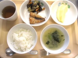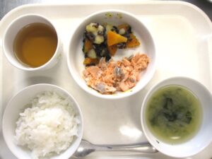 昼食:ご飯、さばの竜田揚げ、じゃがいもとひじき煮、味噌汁、りんご(乳児のみ)