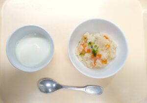 離乳食(後期)昼食:おかゆまたは軟飯、かじきの煮物、人参とじゃがいものごま煮、みそ汁(白菜)