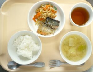 昼食:ごはん、さばの香り焼き、切干大根煮、みそ汁(白菜、じゃがいも)、麦茶