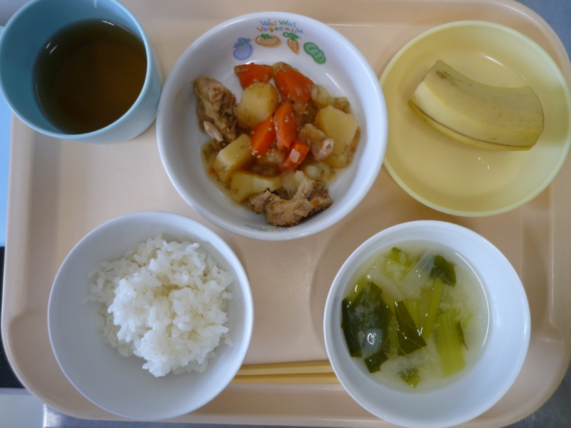 昼食:ご飯、じゃがいもと鶏肉のごま煮、みそ汁(小松菜、たまねぎ)、バナナ、麦茶