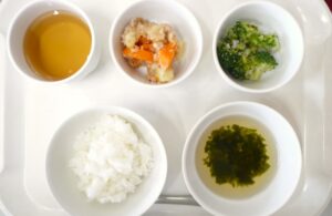 離乳食(後期)昼食:軟飯またはおかゆ、じゃが芋のそぼろ煮、ブロッコリーのじゃこ和え、すまし汁